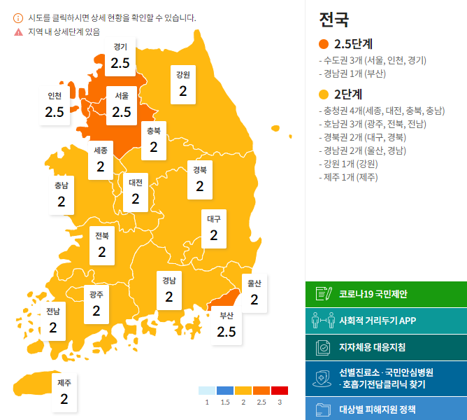 수도권의 사회적 거리두기 2.5단계와 비수도권의 2단계 조...